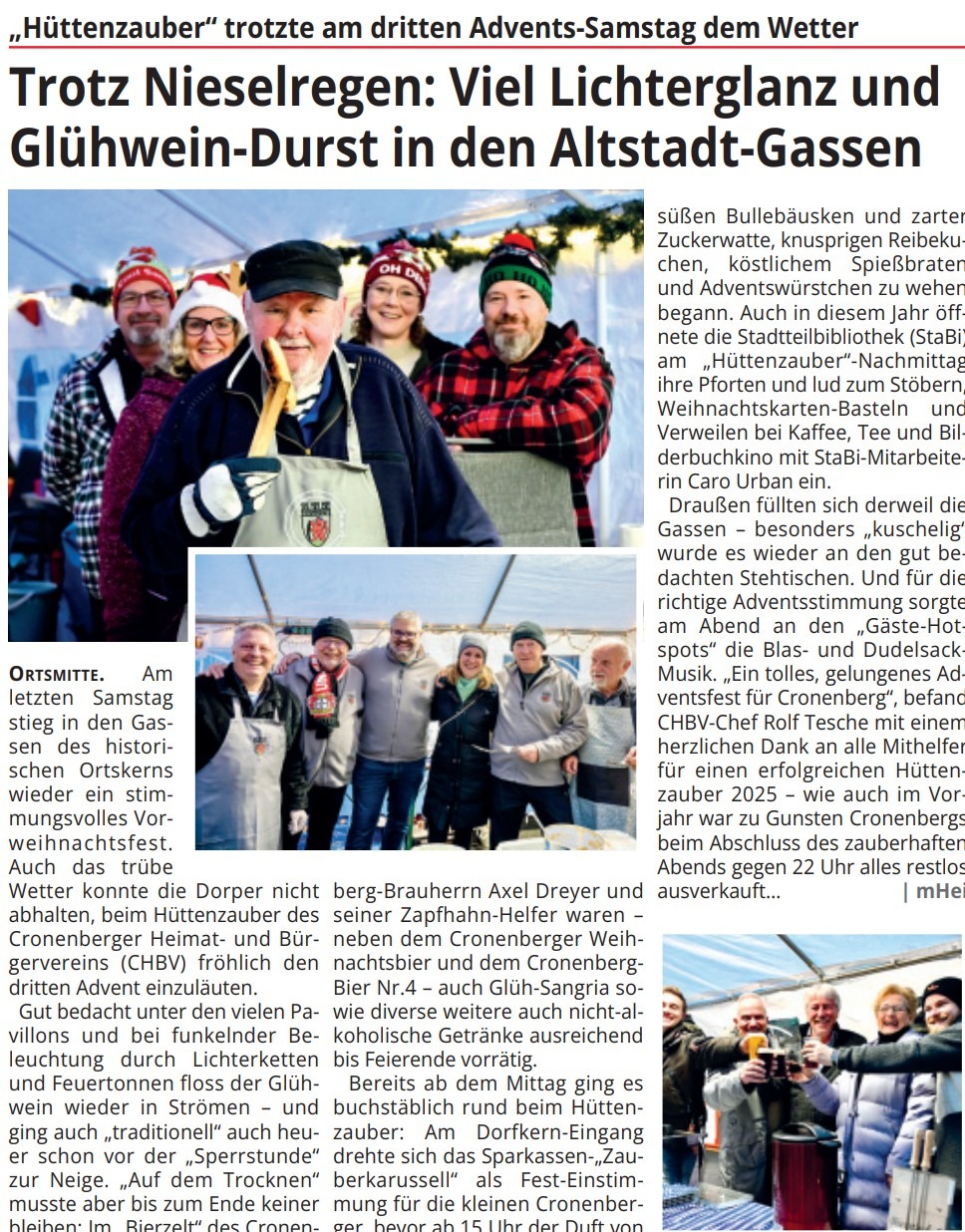ORTSMITTE. Am letzten Samstag stieg in den Gassen des historischen Ortskerns wieder ein stimmungsvolles Vorweihnachtsfest. Auch das trübe Wetter konnte die Dorper nicht abhalten, beim Hüttenzauber des Cronenberger Heimat- und Bürgervereins (CHBV) fröhlich den dritten Advent einzuläuten. Gut bedacht unter den vielen Pavillons und bei funkelnder Beleuchtung durch Lichterketten und Feuertonnen floss der Glühwein wieder in Strömen – und ging auch „traditionell“ auch heuer schon vor der „Sperrstunde“ zur Neige. „Auf dem Trocknen“ musste aber bis zum Ende keiner bleiben: Im „Bierzelt“ des Cronenberg-Brauherrn Axel Dreyer und seiner Zapfhahn-Helfer waren – neben dem Cronenberger Weihnachtsbier und dem CronenbergBier Nr.4 – auch Glüh-Sangria sowie diverse weitere auch nicht-alkoholische Getränke ausreichend bis Feierende vorrätig. Bereits ab dem Mittag ging es buchstäblich rund beim Hüttenzauber: Am Dorfkern-Eingang drehte sich das Sparkassen-„Zauberkarussell“ als Fest-Einstimmung für die kleinen Cronenberger, bevor ab 15 Uhr der Duft von süßen Bullebäusken und zarter Zuckerwatte, knusprigen Reibekuchen, köstlichem Spießbraten und Adventswürstchen zu wehen begann. Auch in diesem Jahr öffnete die Stadtteilbibliothek (StaBi) am „Hüttenzauber“-Nachmittag ihre Pforten und lud zum Stöbern, Weihnachtskarten-Basteln und Verweilen bei Kaffee, Tee und Bilderbuchkino mit StaBi-Mitarbeiterin Caro Urban ein. Draußen füllten sich derweil die Gassen – besonders „kuschelig“ wurde es wieder an den gut bedachten Stehtischen. Und für die richtige Adventsstimmung sorgte am Abend an den „Gäste-Hotspots“ die Blas- und DudelsackMusik. „Ein tolles, gelungenes Adventsfest für Cronenberg“, befand CHBV-Chef Rolf Tesche mit einem herzlichen Dank an alle Mithelfer für einen erfolgreichen Hüttenzauber 2025 – wie auch im Vorjahr war zu Gunsten Cronenbergs beim Abschluss des zauberhaften Abends gegen 22 Uhr alles restlos ausverkauft… Quelle: Cronenberger Woche, Ausgabe vom 19./20.12.2025